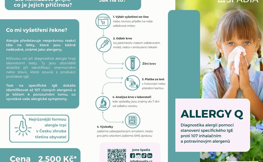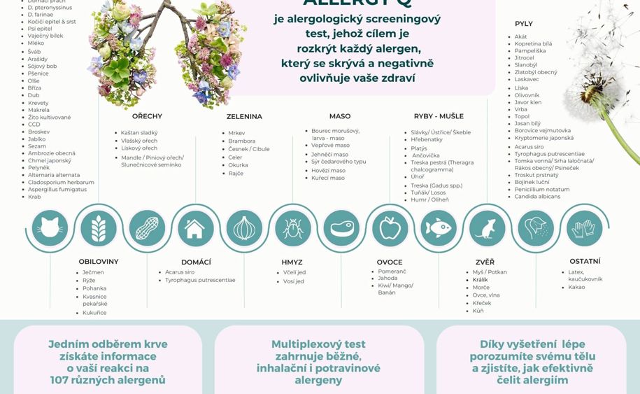 Tento rok jsme rozšířili nabídku laboratorní diagnostiky alergií a zavedli jsme nové multiplexové vyšetření ALLERGY Q. Novinka je zajímavá svým rozsahem, protože je schopná identifikovat alergickou reakci na celkem 107 alergenů a zahrnuje široké spektrum potenciálních alergenů, od běžných pylových alergenů, přes potravinové alergeny, až po ty méně běžné.