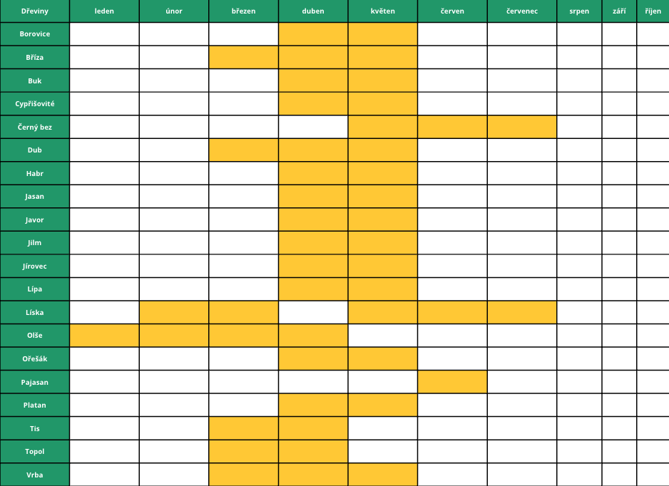 Hlavní alergeny: Mezi nejagresivnější patří olše a líska, které startují sezónu (leden–březen). Následuje obávaná bříza, jejíž pyl patří k nejsilnějším alergenům vůbec a vrcholí v dubnu a květnu.