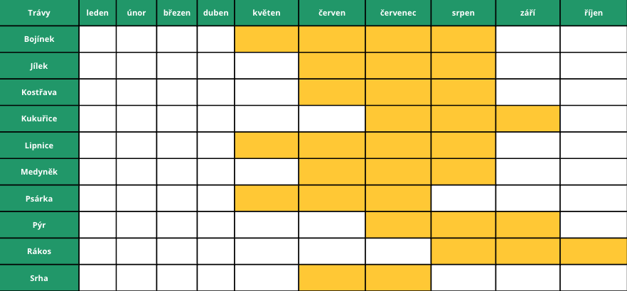 Vrchol sezóny: Hlavní nápor přichází v červnu a červenci. Mezi typické zástupce patří bojínek, jílek, kostřava nebo srha.