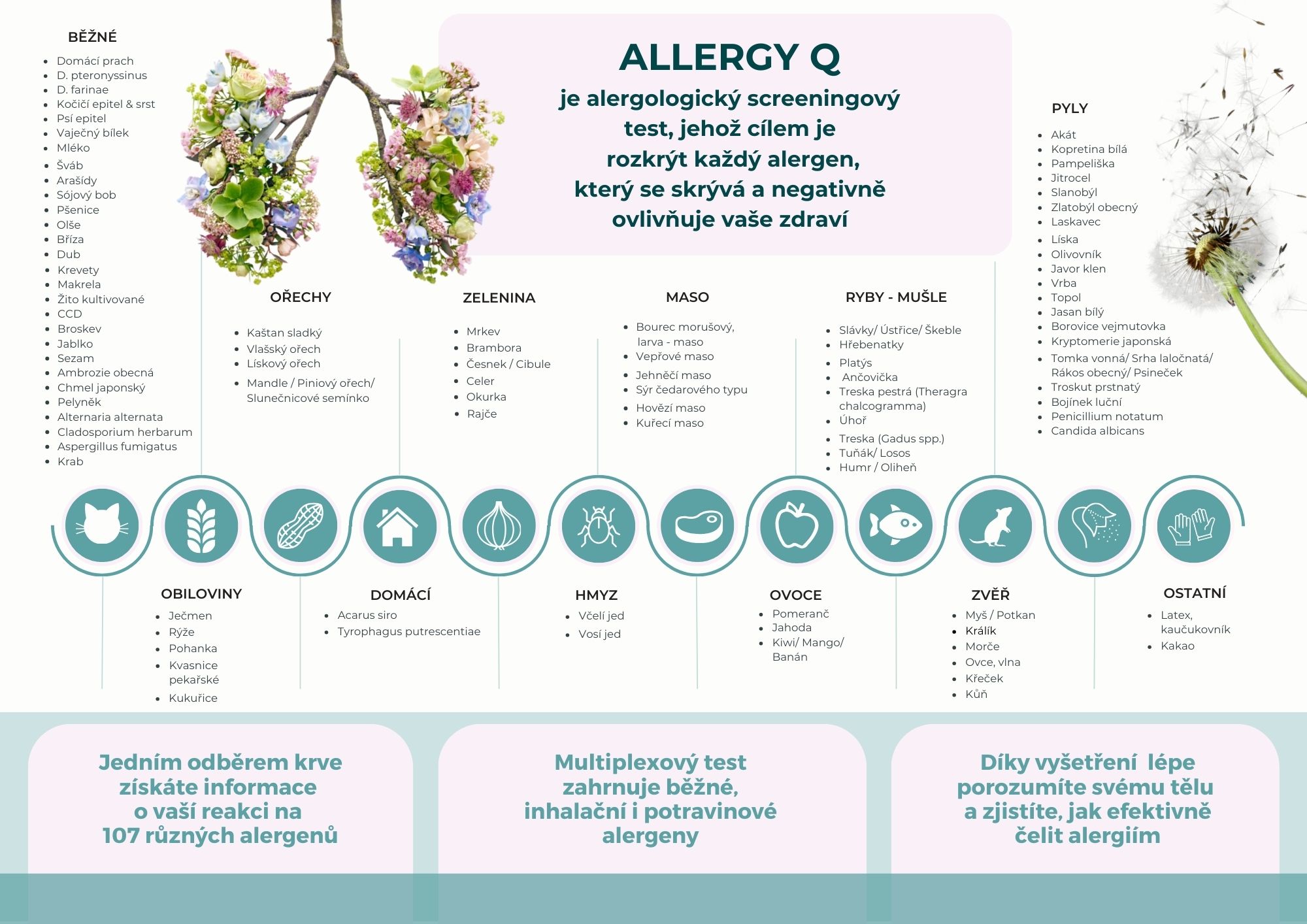 Odhalte příčinu svých obtíží s nejširším testem Allergy Q. Neustálé kýchání, pálení očí, ekzémy nebo zažívací potíže po jídle? Alergie se může projevit kdykoliv během života. Panelové vyšetření Allergy Q je nejefektivnější cesta, jak z jednoho vzorku krve identifikovat širokou škálu inhalačních i potravinových alergenů.