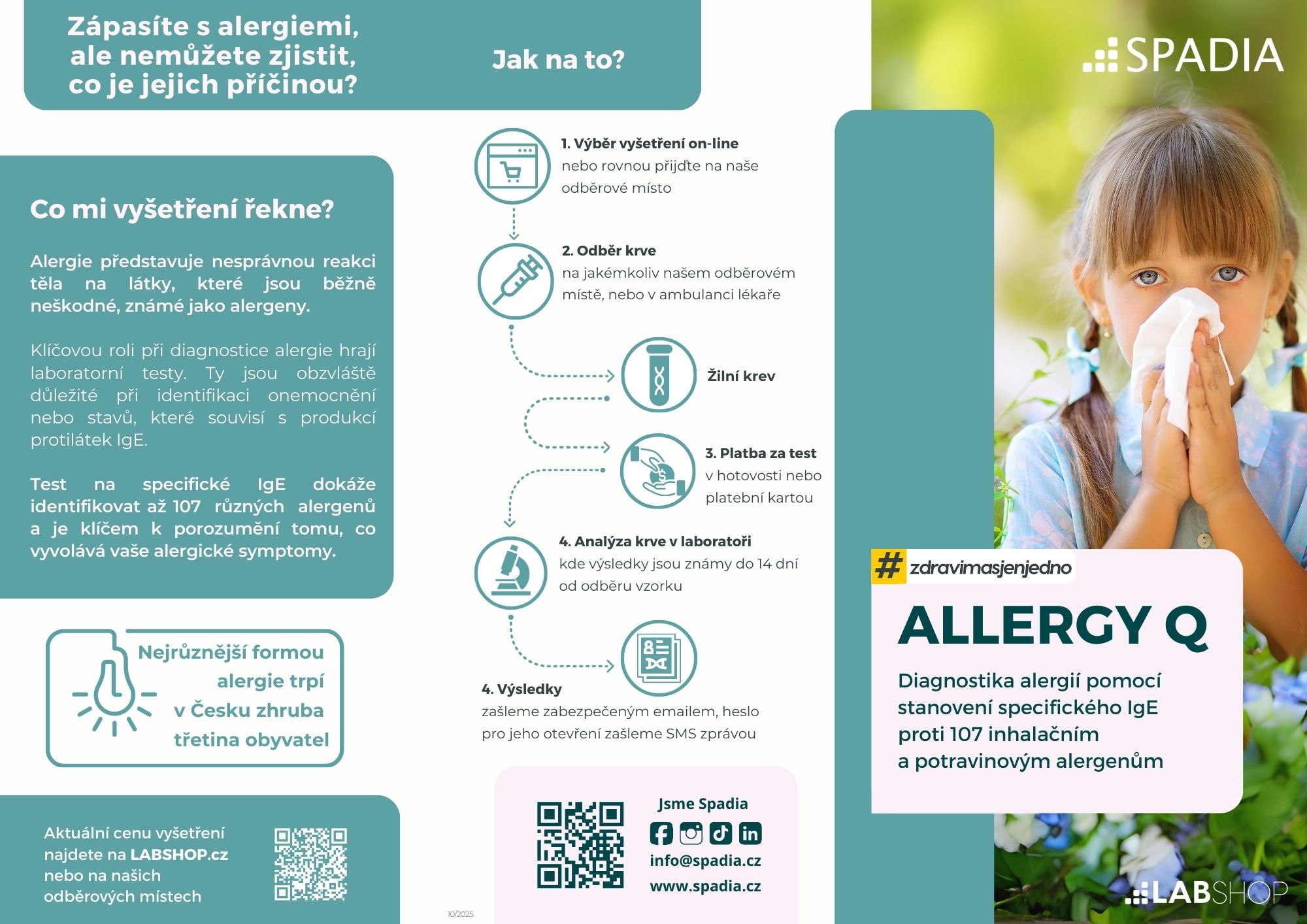 Allergy Q dokáže přesně identifikovat, na které látky vaše tělo reaguje přehnaně – ať už jde o mléko, lepek, vejce, pyl nebo roztoče. Vyšetření probíhá z malého množství krve a poskytuje spolehlivé výsledky, které vám pomohou cíleně upravit stravování i životní styl. Díky tomu lze výrazně zmírnit obtíže a posílit celkovou imunitní rovnováhu.