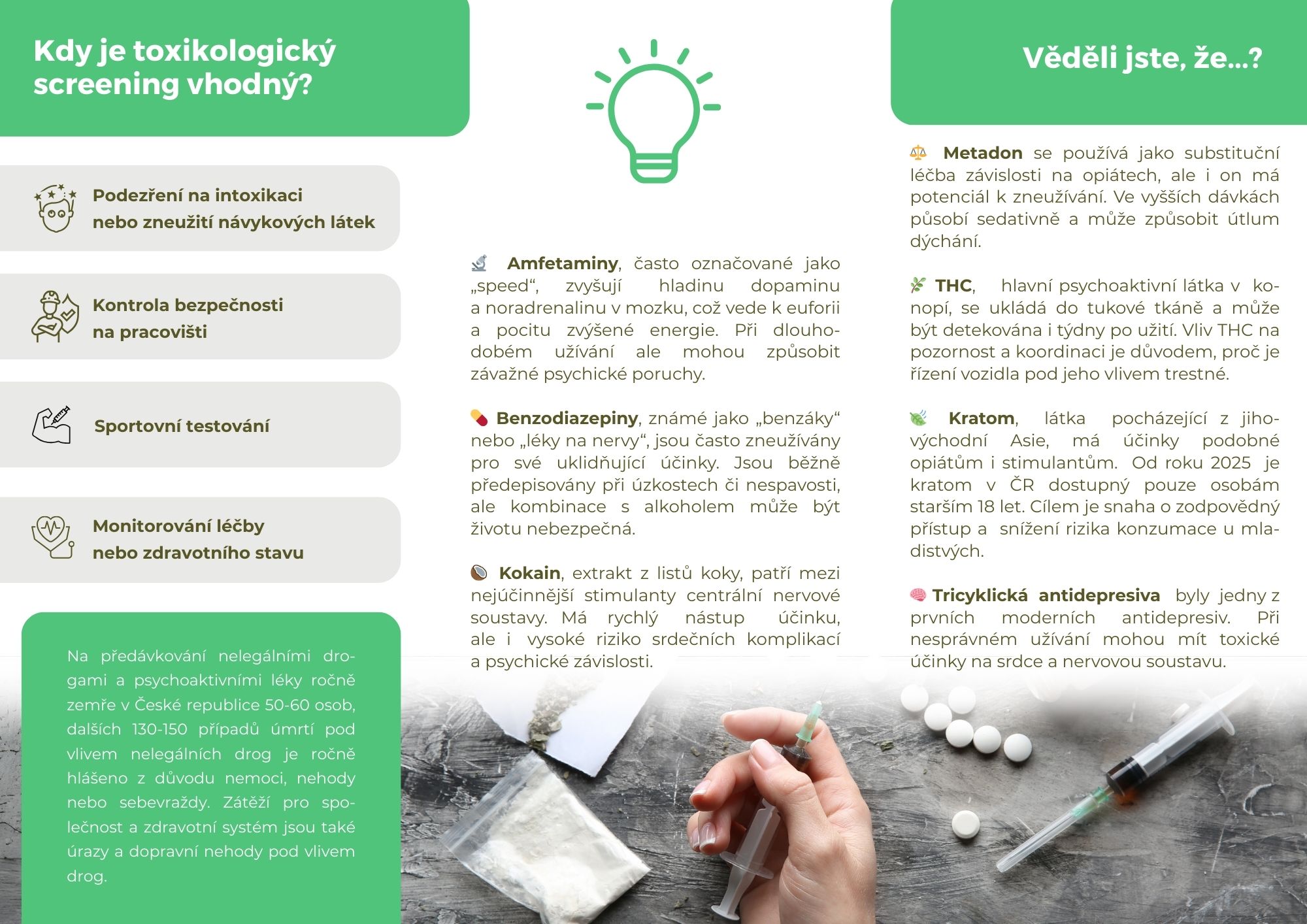 Screeningové testy poskytují rychlý přehled, který lze v případě pozitivního výsledku potvrdit metodou LC-MS. Díky včasnému záchytu pomáhá chránit zdraví, bezpečnost i odpovědnost jedince.