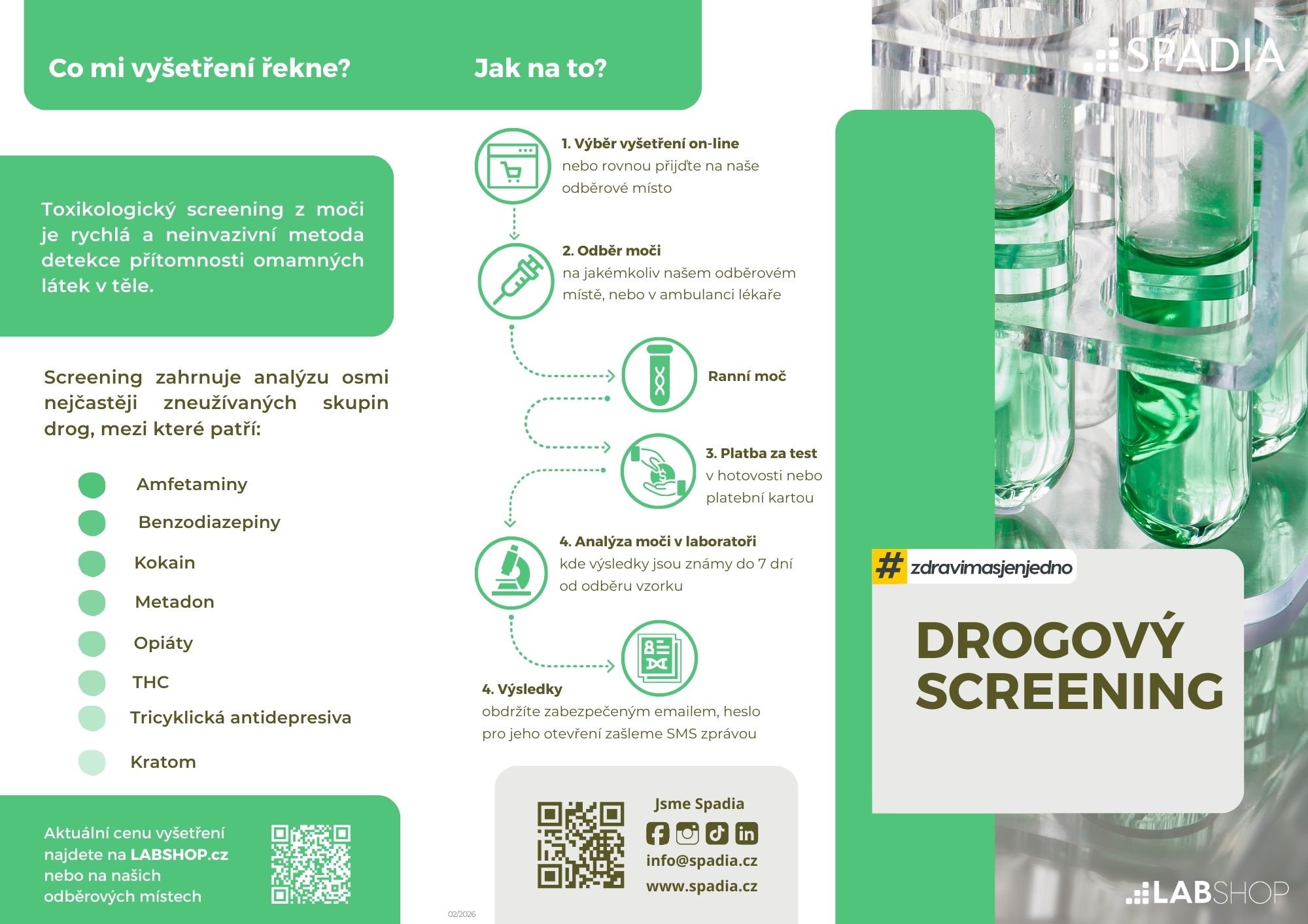 Drogový screening je laboratorní vyšetření, které odhaluje přítomnost omamných a psychotropních látek v organismu. Test lze provést z moči nebo krve a slouží k detekci nejčastějších skupin drog – amfetaminů, kokainu, opiátů, benzodiazepinů, THC či metamfetaminu. Vyšetření se využívá při pracovních prohlídkách, dopravně-psychologických vyšetřeních, v medicíně práce i při podezření na zneužívání návykových látek.