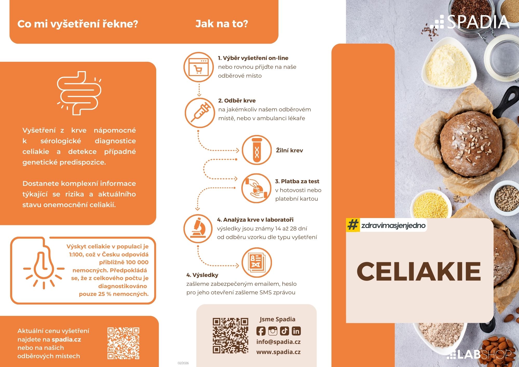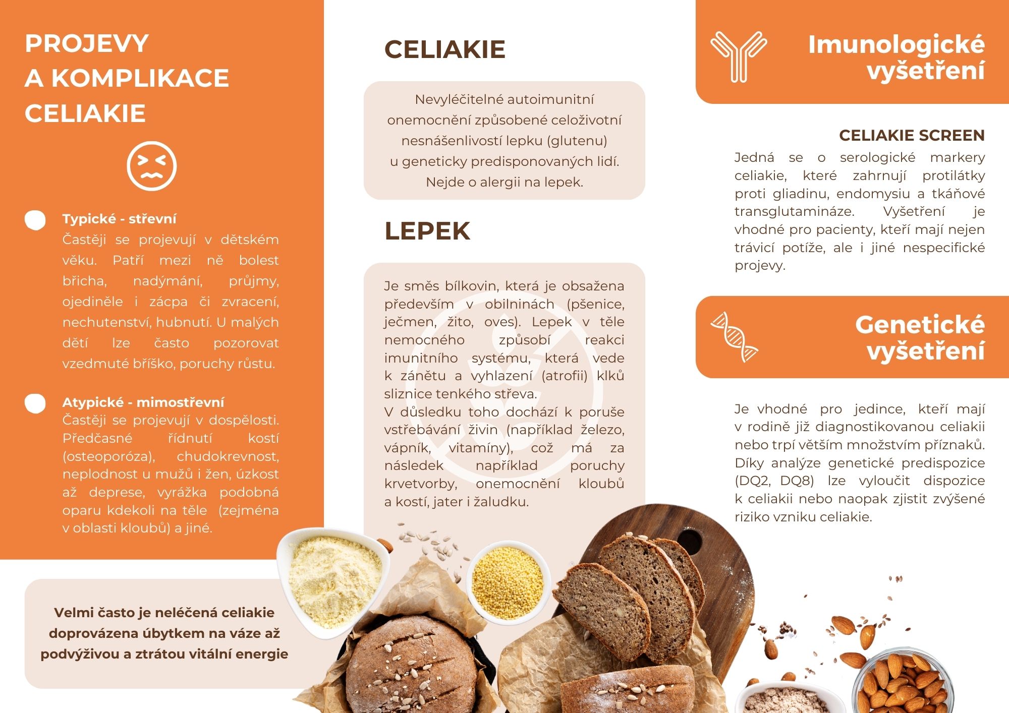 Celiakie je autoimunitní onemocnění, při kterém organismus reaguje nepřiměřeně na lepek – bílkovinu obsaženou v pšenici, žitě a ječmeni. Vyvolává zánět tenkého střeva, poruchu vstřebávání živin a může vést k anémii, únavě, kožním problémům či neplodnosti. Genetické vyšetření celiakie analyzuje přítomnost genů HLA-DQ2 a HLA-DQ8, které jsou nezbytným předpokladem pro vznik onemocnění. Pokud test tyto geny nepotvrdí, lze celiakii s vysokou jistotou vyloučit. Naopak jejich přítomnost značí zvýšené riziko a je důvodem k dalšímu laboratornímu či gastroenterologickému vyšetření. Test je vhodný pro jedince s dlouhodobými trávicími obtížemi, autoimunitními chorobami či rodinnou zátěží celiakií.