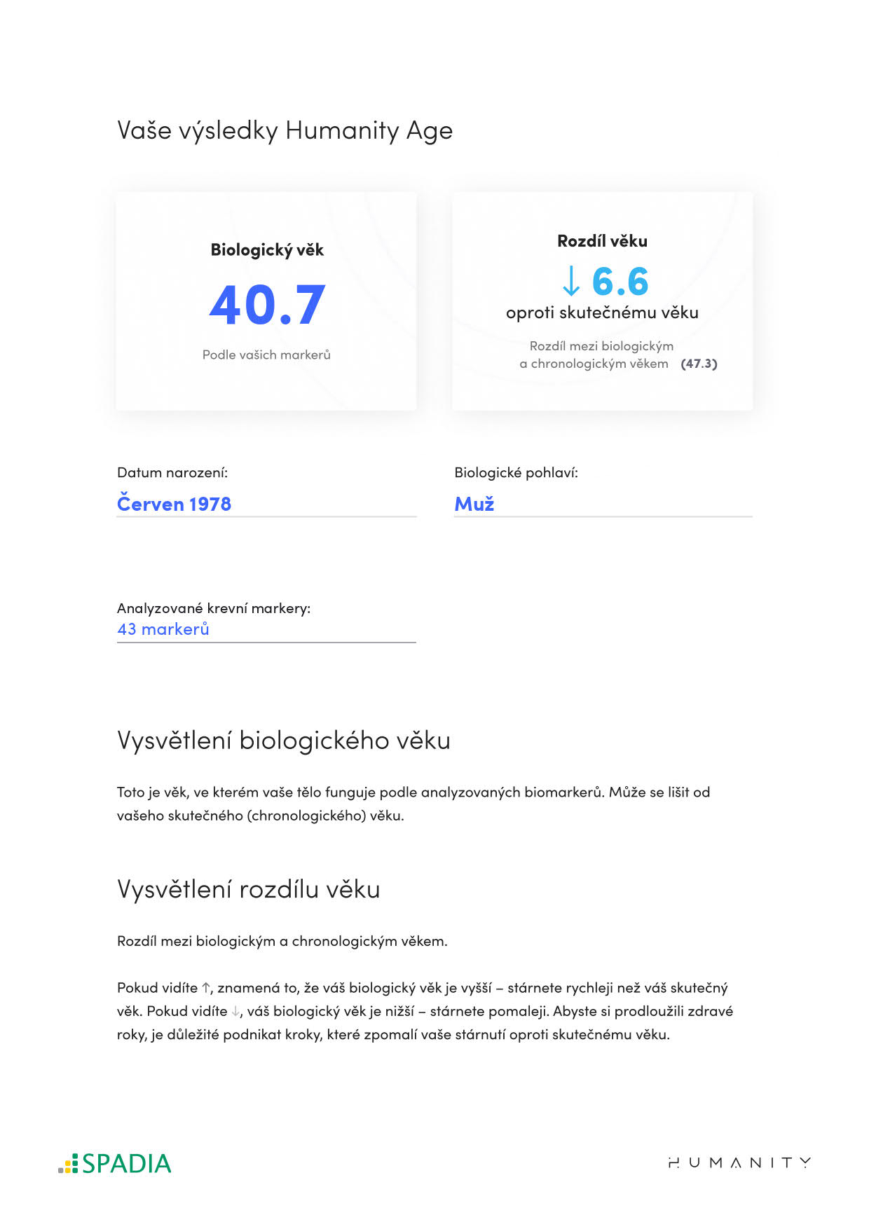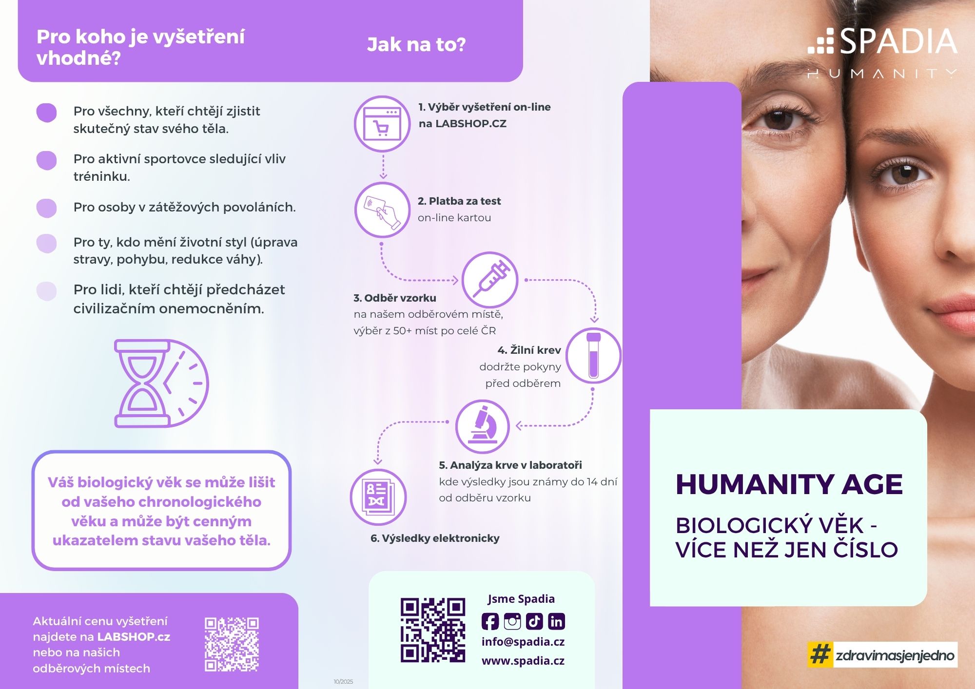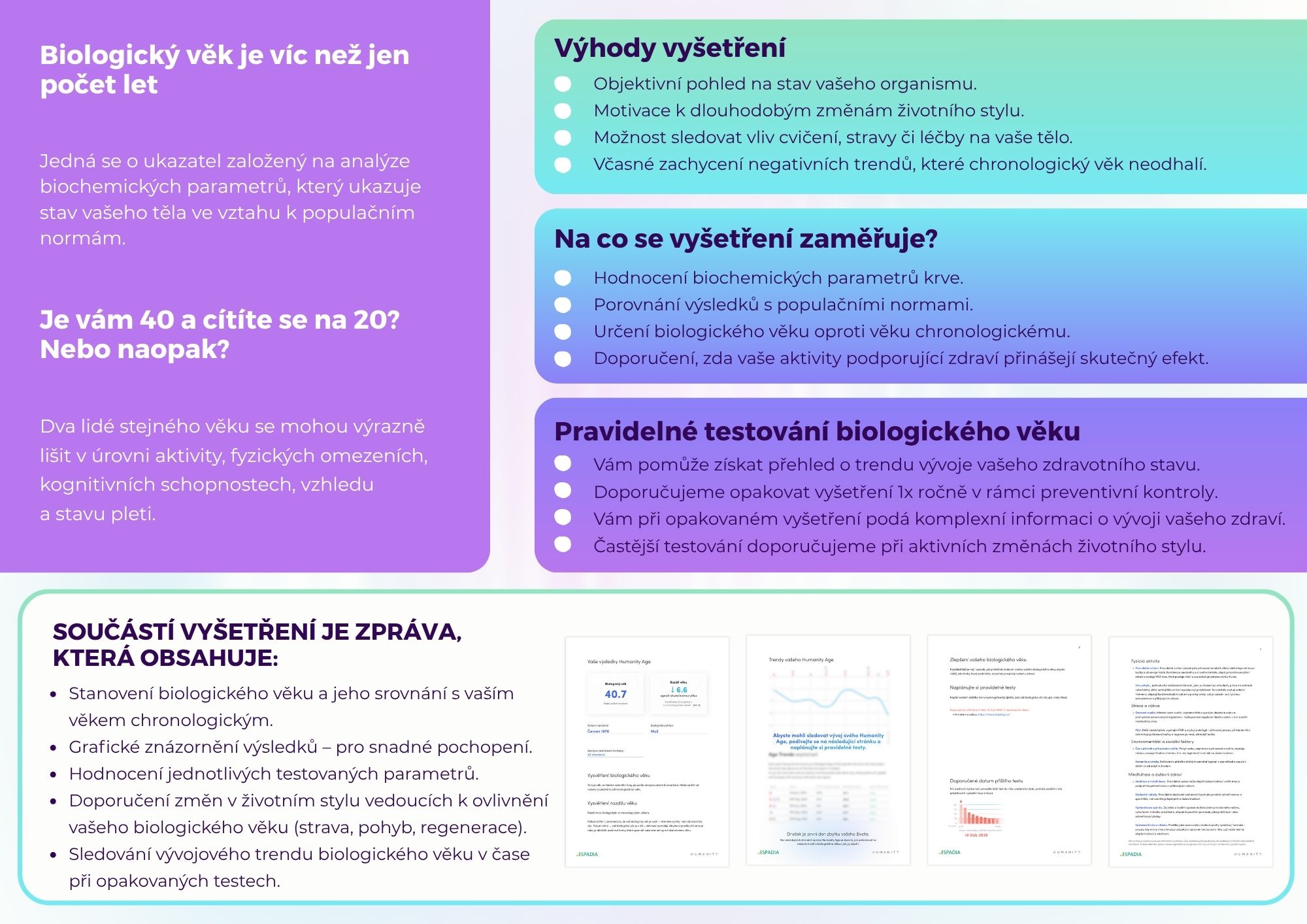 Komplexní laboratorní test, který kombinuje více než 20 biomarkerů pro co nejpřesnější odhad vašeho biologického věku. Zjistěte, jak vaše tělo skutečně stárne a získejte doporučení pro zlepšení vašeho zdraví. Kalendářní věk a biologický věk se mohou často lišit a díky tomuto vyšetření zjistíte jak na tom vaše tělo skutečně je.