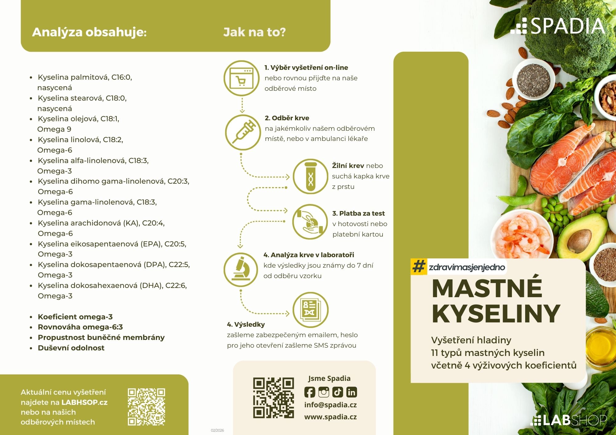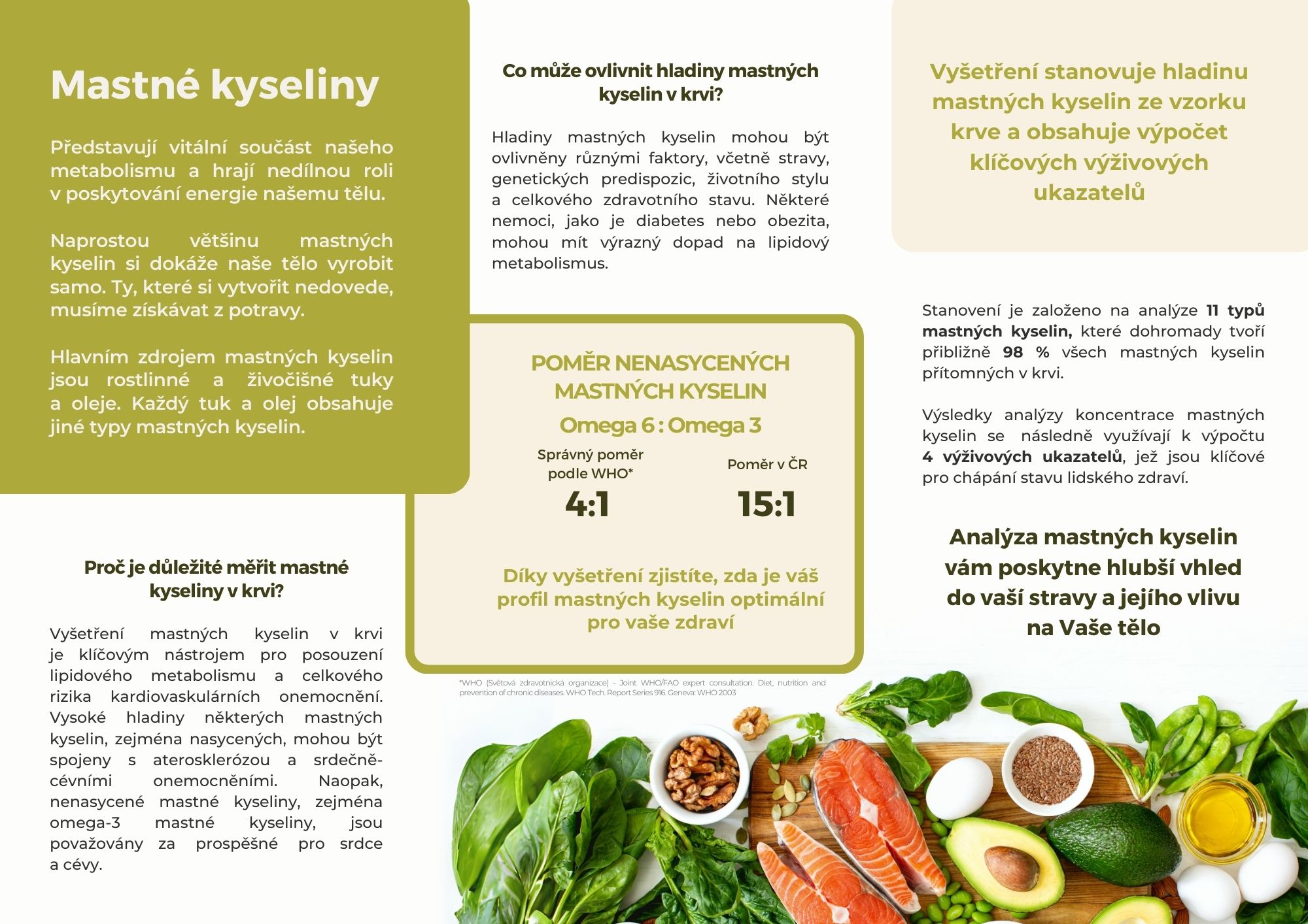 Mastné kyseliny jsou nezbytnou součástí zdravého metabolismu a mají zásadní vliv na fungování celého organismu. Jsou důležité pro správnou činnost srdce, mozku, nervového i imunitního systému. Vyšetření hladin mastných kyselin v krvi poskytuje podrobný přehled o poměru mezi omega-3 a omega-6 mastnými kyselinami, které hrají klíčovou roli v regulaci zánětlivých procesů. Pokud je tento poměr narušen, mohou se v těle rozvíjet chronické záněty, únava, oslabená imunita či zvýšené riziko civilizačních onemocnění – například aterosklerózy, diabetu nebo depresí.